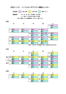 HOME > 予防接種 > インフルエンザワクチンについて(2025シーズン) > 2025シーズン インフルワクチンカレンダー お知らせ 2025シーズン インフルワクチンカレンダー 2025.07.10 トップへ戻る お知らせ一覧へ戻る
