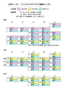 HOME > 予防接種 > インフルエンザワクチンについて(2025シーズン) > 2025シーズン インフルワクチンカレンダー お知らせ 2025シーズン インフルワクチンカレンダー 2025.07.10 トップへ戻る お知らせ一覧へ戻る